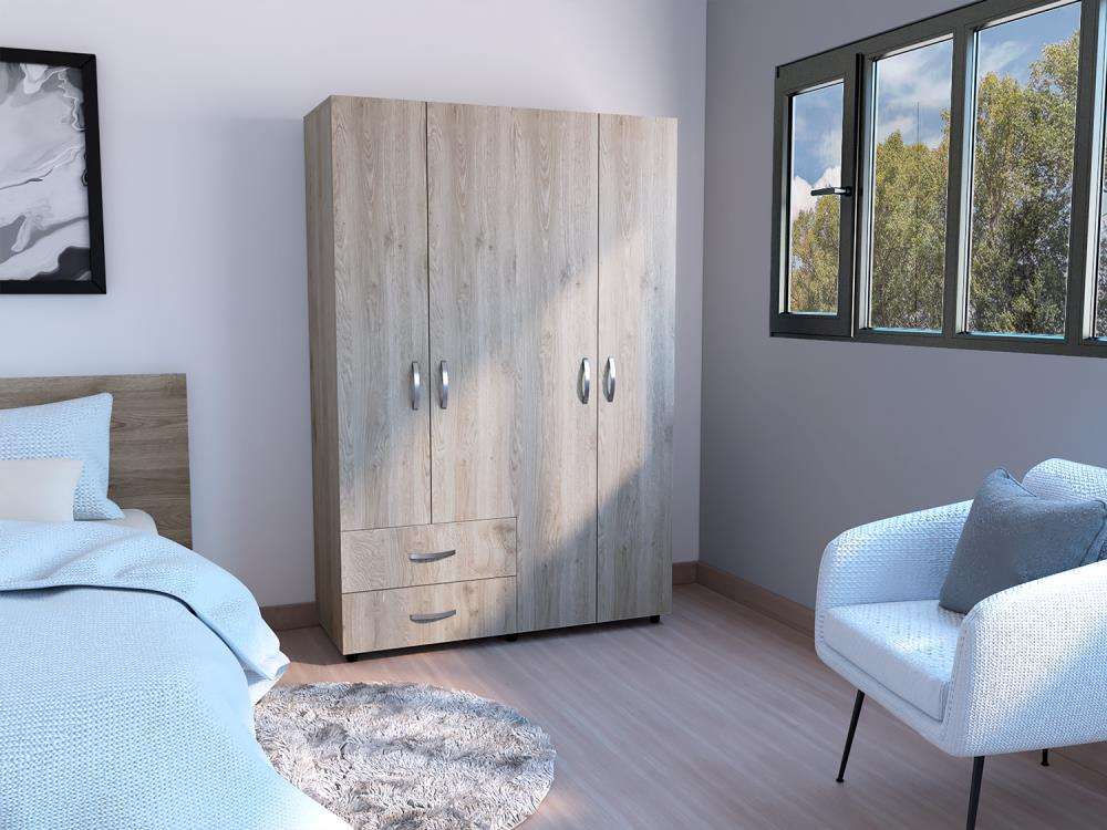 Características: Producto: Closet Ankora Basic. Con colgador de ropa, cuatro puertas abatibles, entrepaños para poner ropa, dos cajones