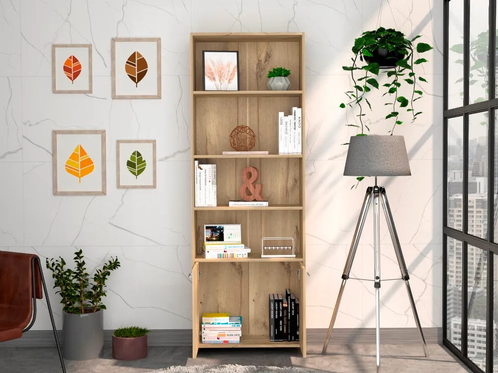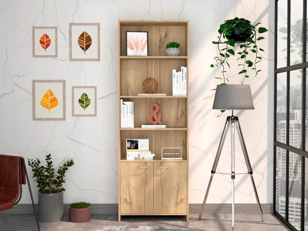 Características: Biblioteca Lisa, dos puertas abatibles, manijas metálicas, amplios espacios para ubicar libros y objetos decorativos