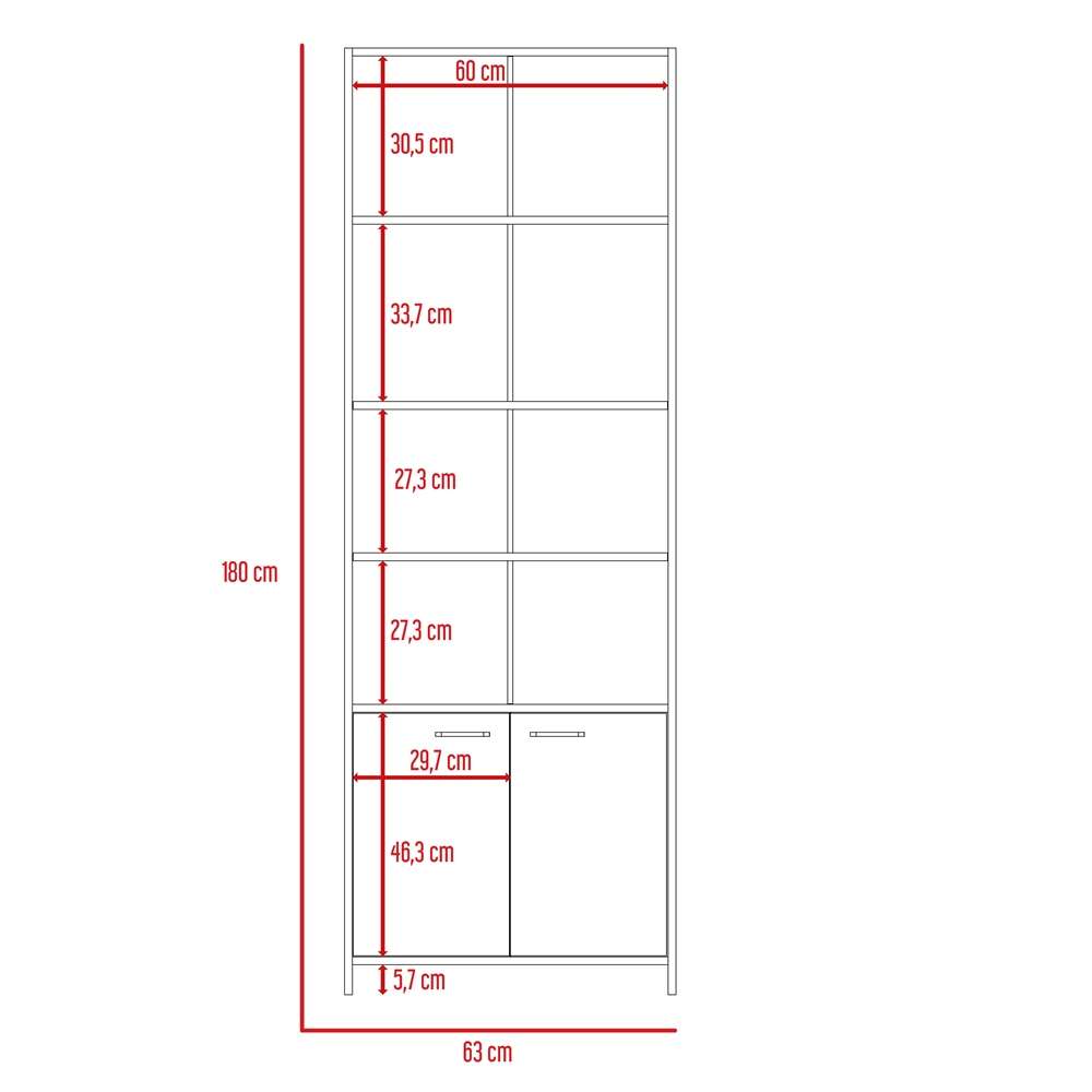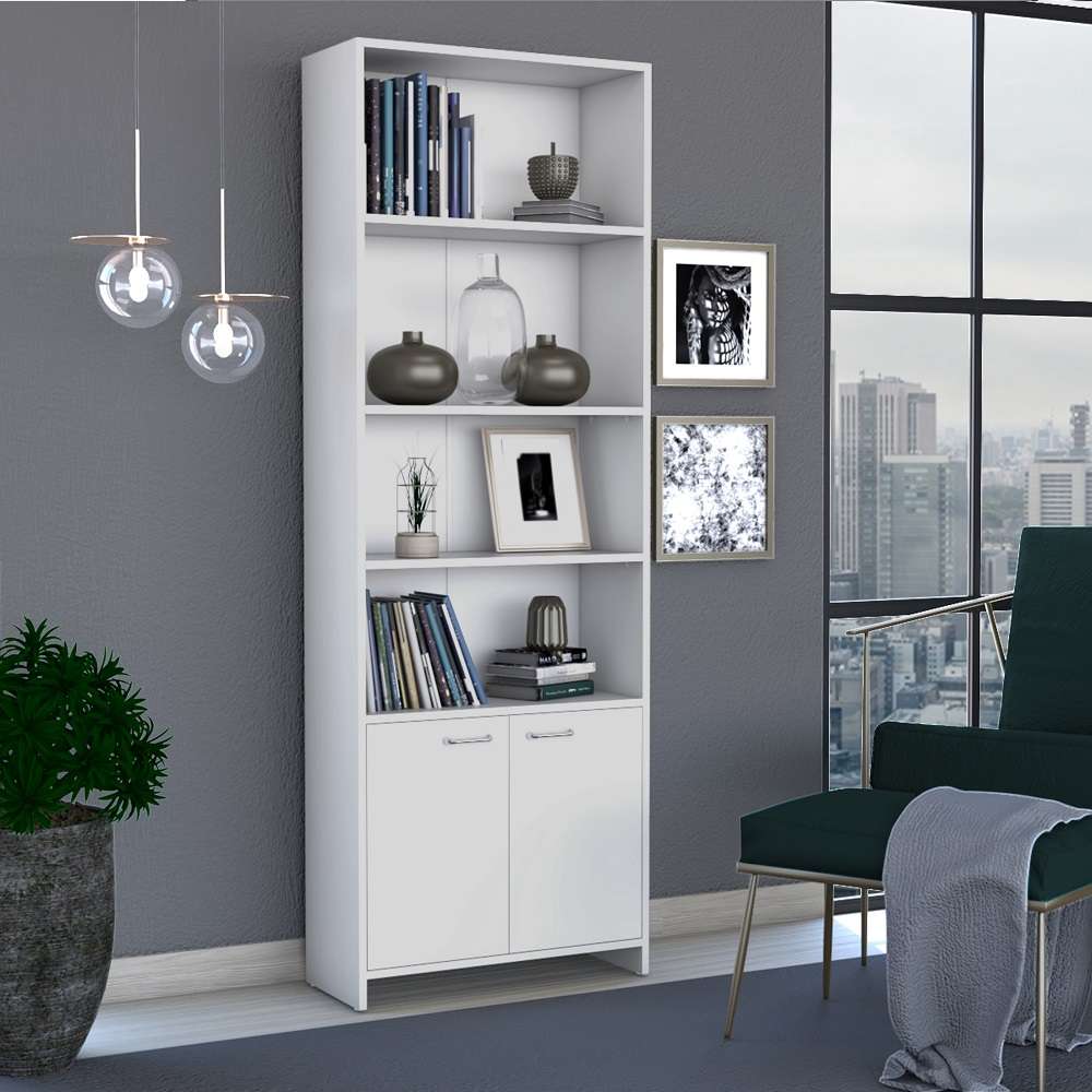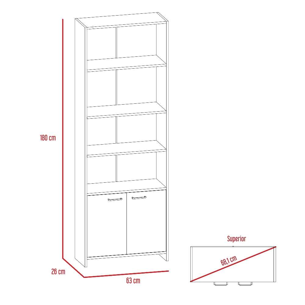 Características: Biblioteca Lisa, con espacios para colocar libros y objetos decorativos, dos puertas abatibles, manijas metálicas, diseño moderno
