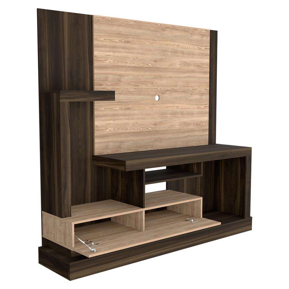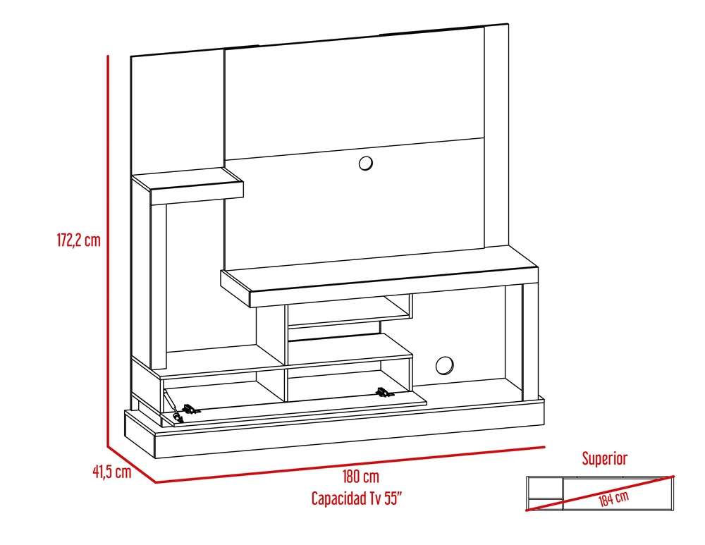 Características: Centro de Entretenimiento Alcaceres. Con diseño multifuncional y vanguardia, espacio para central para TV de 55'' máximo, espacios inferiores para colocar equipos de audio y video, compartimientos para objetos decorativos, una puerta abatible
