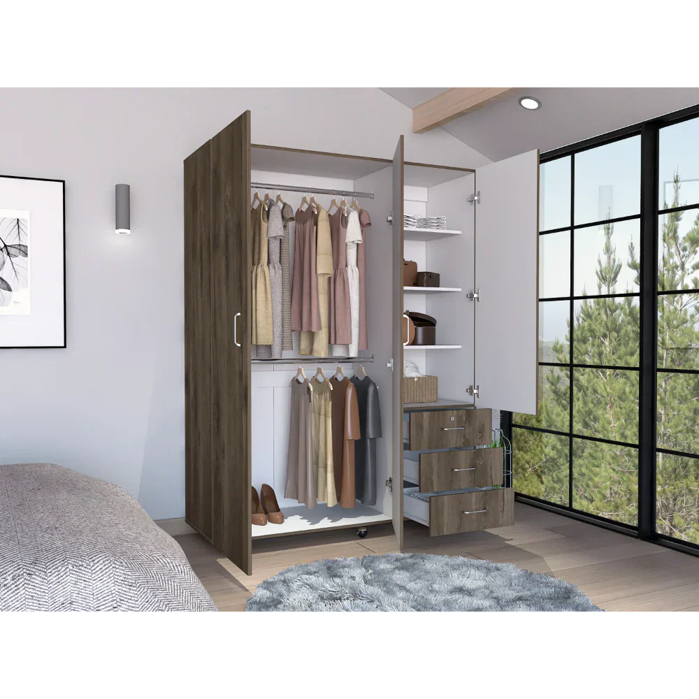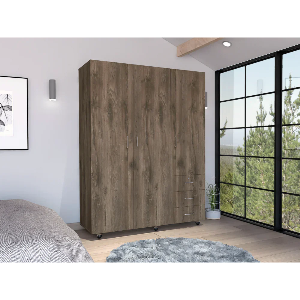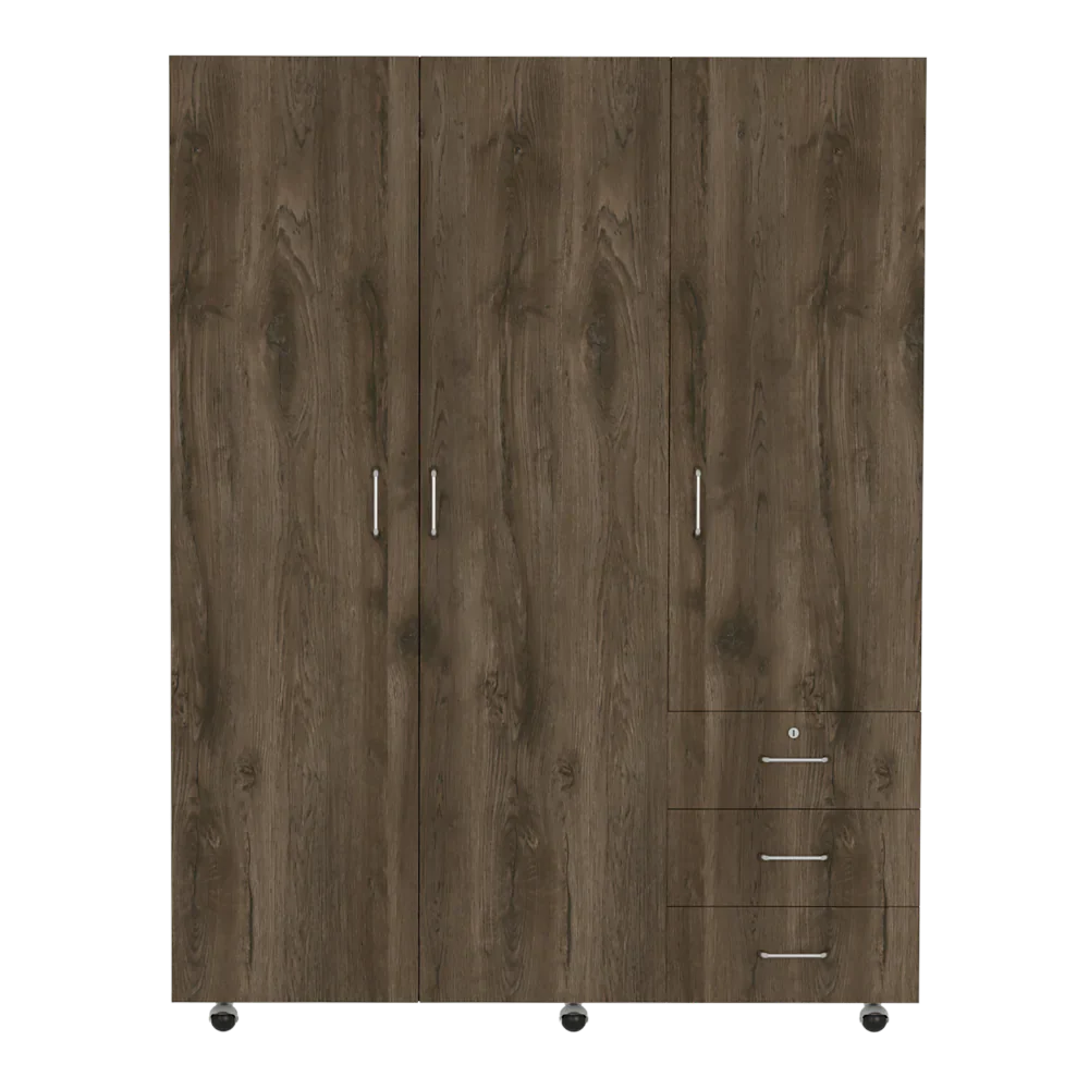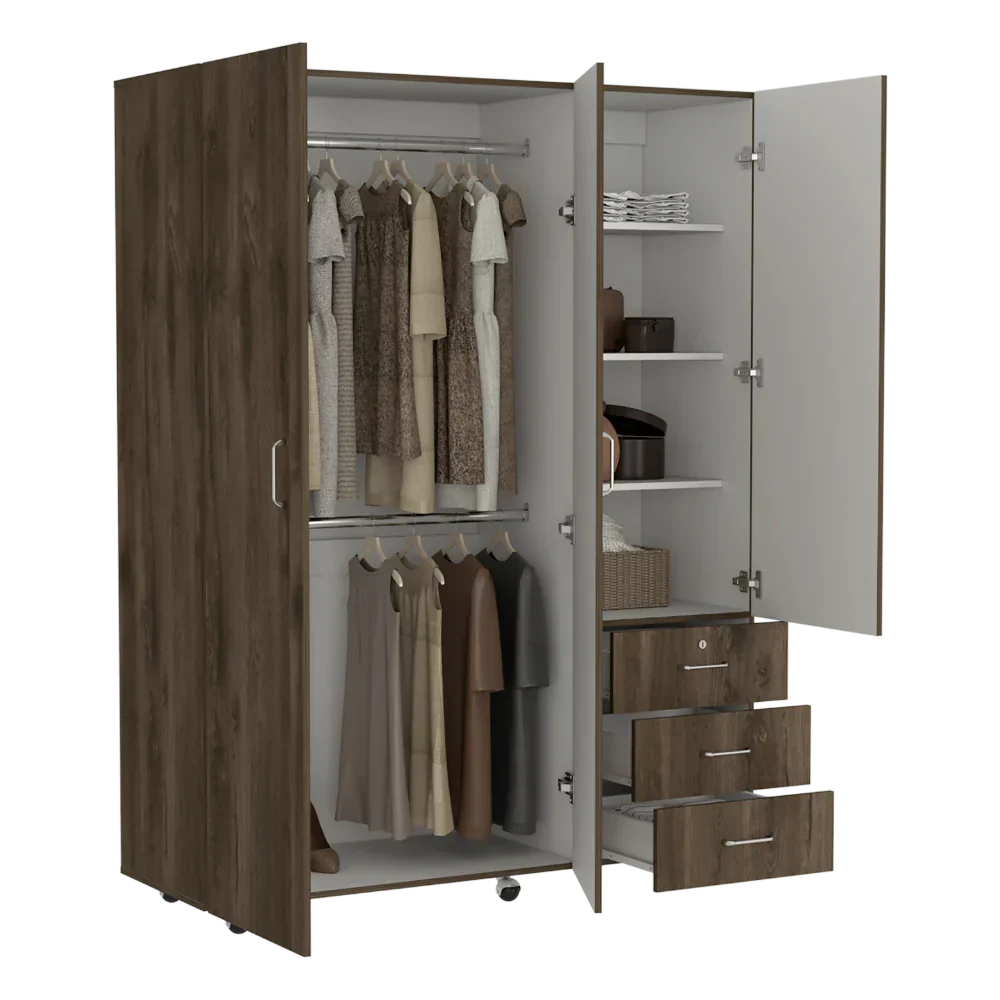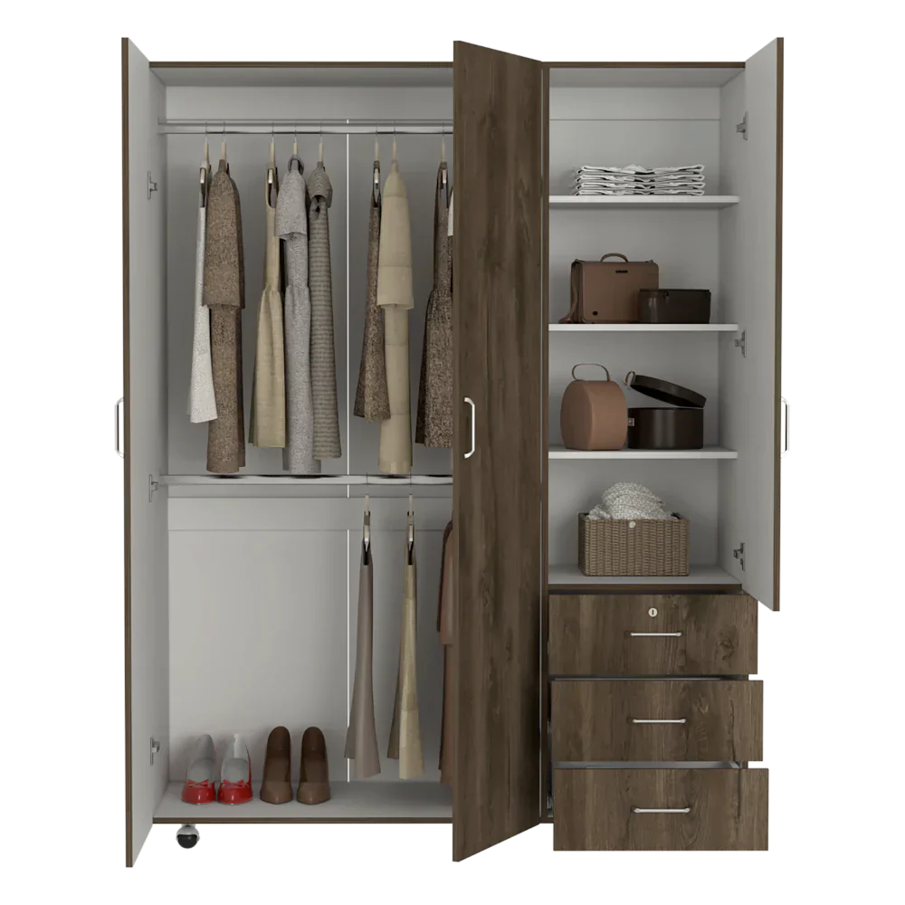 Características: Closet con tres puertas abatibles, tres cajones uno con cerradura, dos tubos de acero cromado para colgar ropa, amplios espacios para guardar ropa