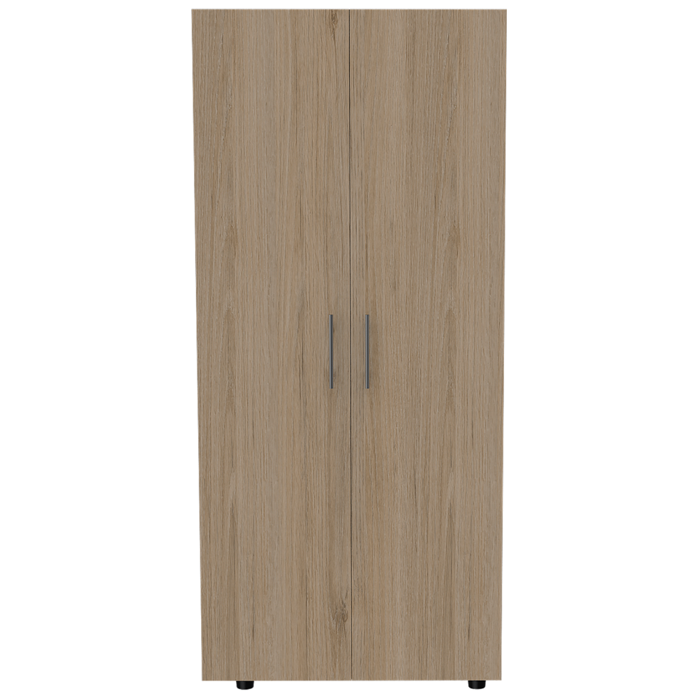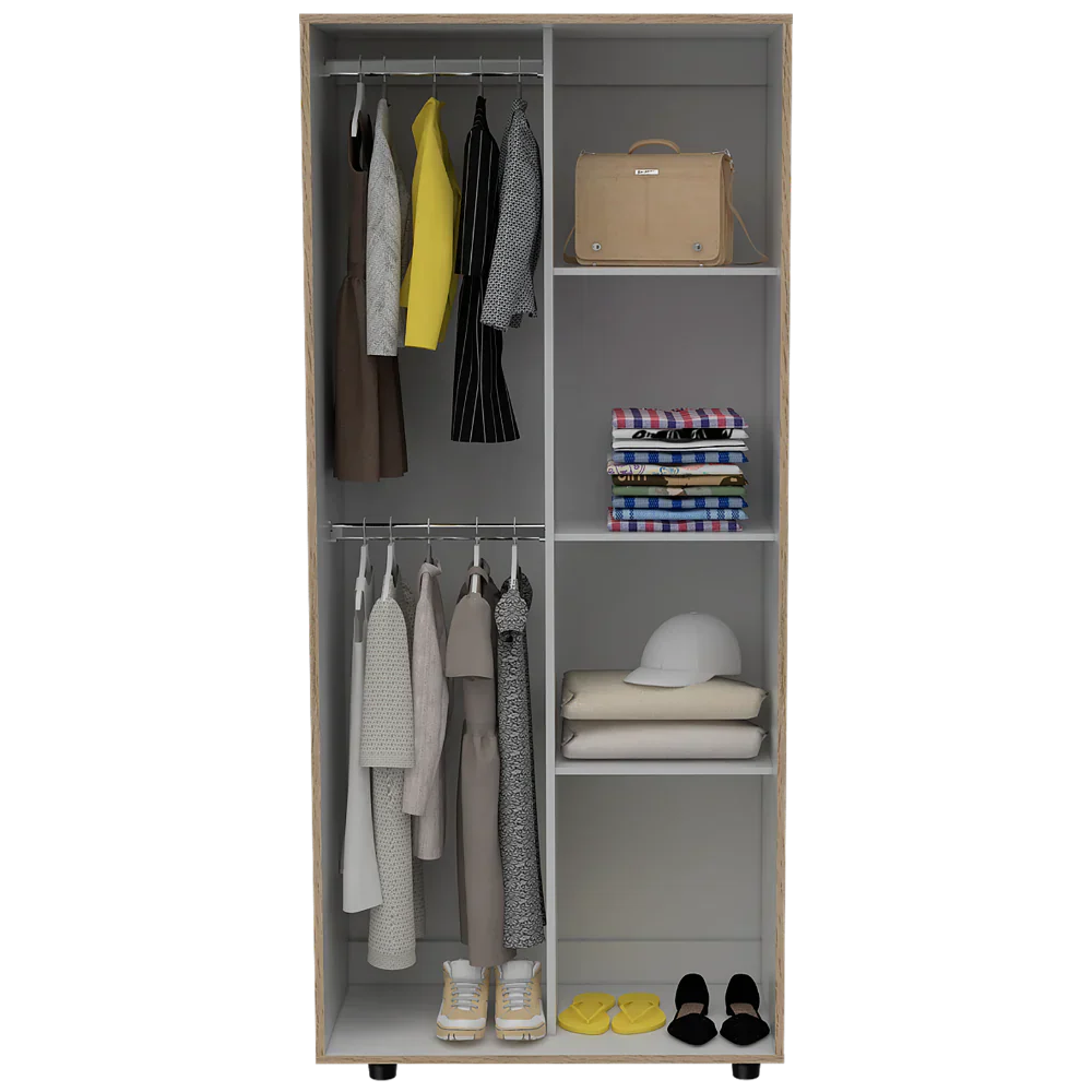 Características: Closet con dos puertas batientes, dos tubos cromados para colgar prendas, tres entrepaños para organizar