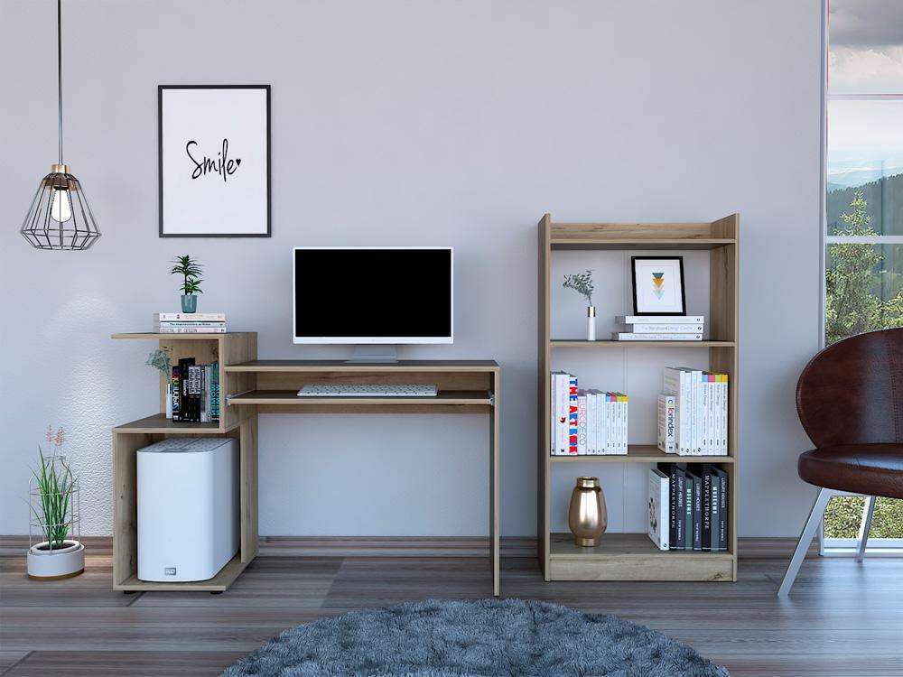 Características: Combo de Escritorio medidas de 82 x 120 x 46, con diseño simple y moderno, combinación de color, amplio espacio de trabajo, torre lateral con entrepaños, bandeja porta teclados deslizables, fácil armado e instalación, biblioteca pequeña de 120 x 63 x 30 con diseño practico, espacio para libros y objetos decorativos, sirve para organizar de forma fácil y rápida
