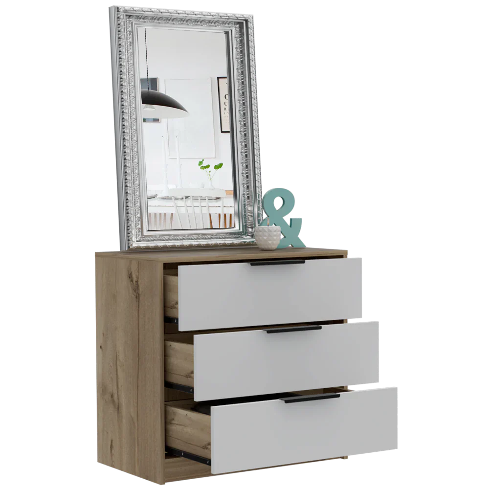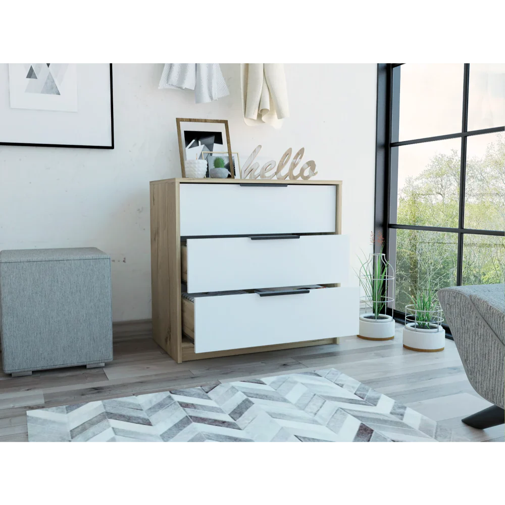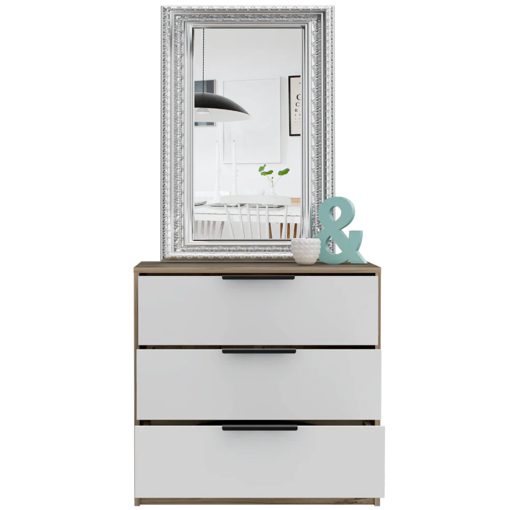 Características: Comoda 3 Cajones Kaia, diseño moderno con combinación de colores, manijas metálicas, superficie para elementos decorativos
