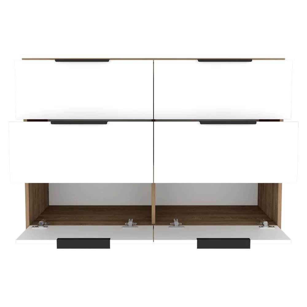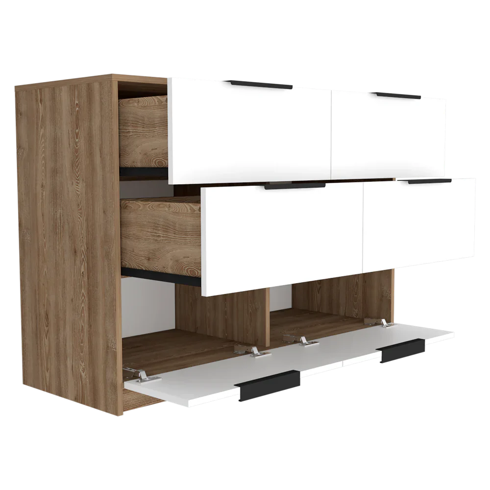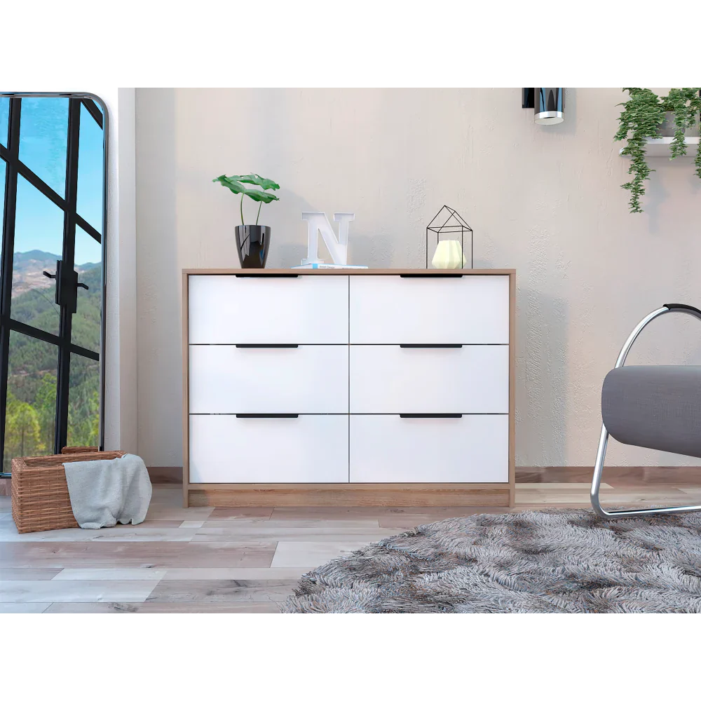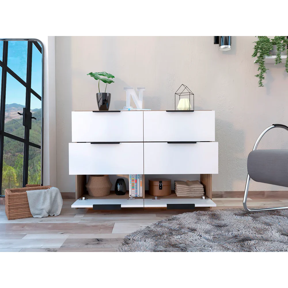 Características: Cómoda con cuatro cajones amplios, diseño moderno con combinación de colores, manijas metálicas, superficie para elementos decorativos
