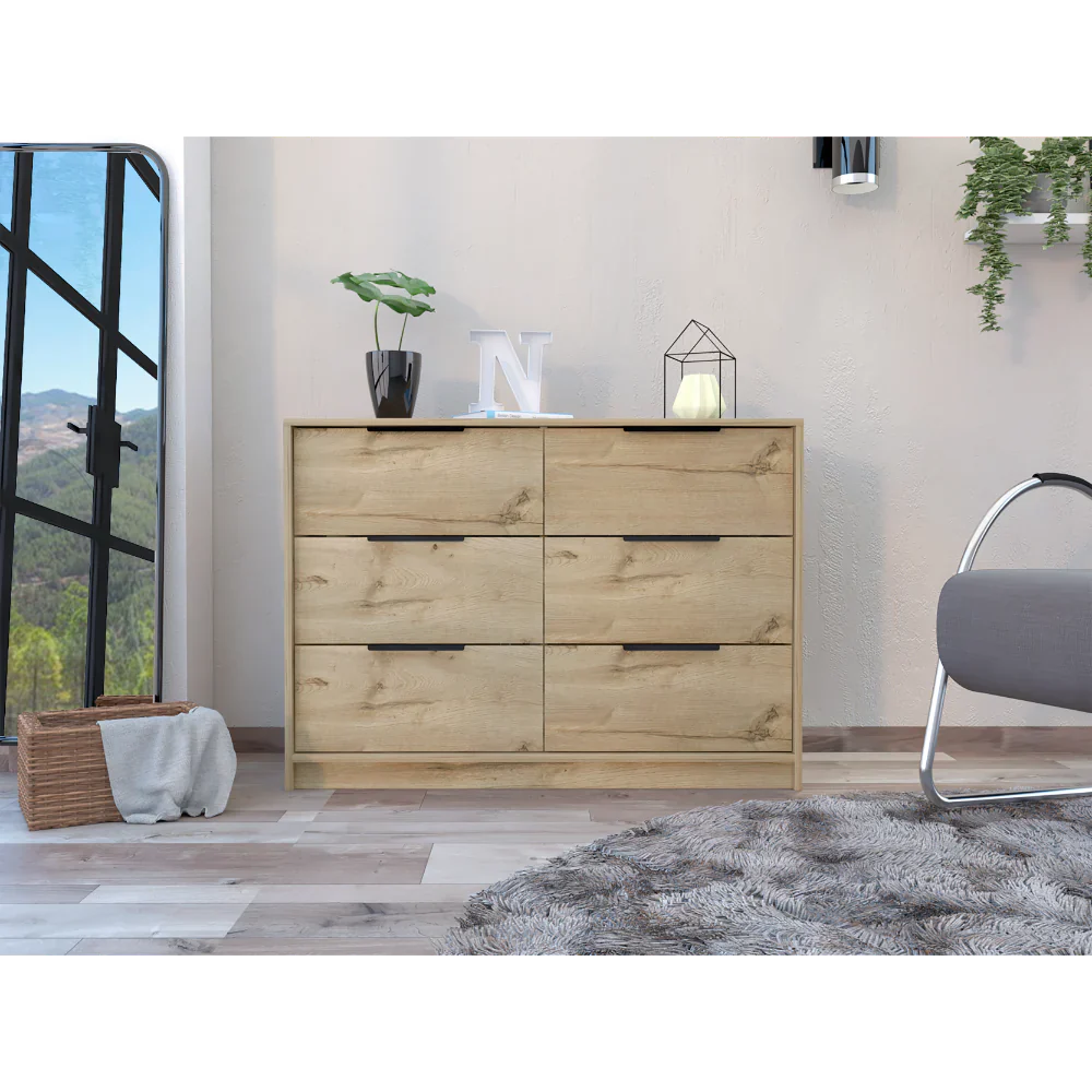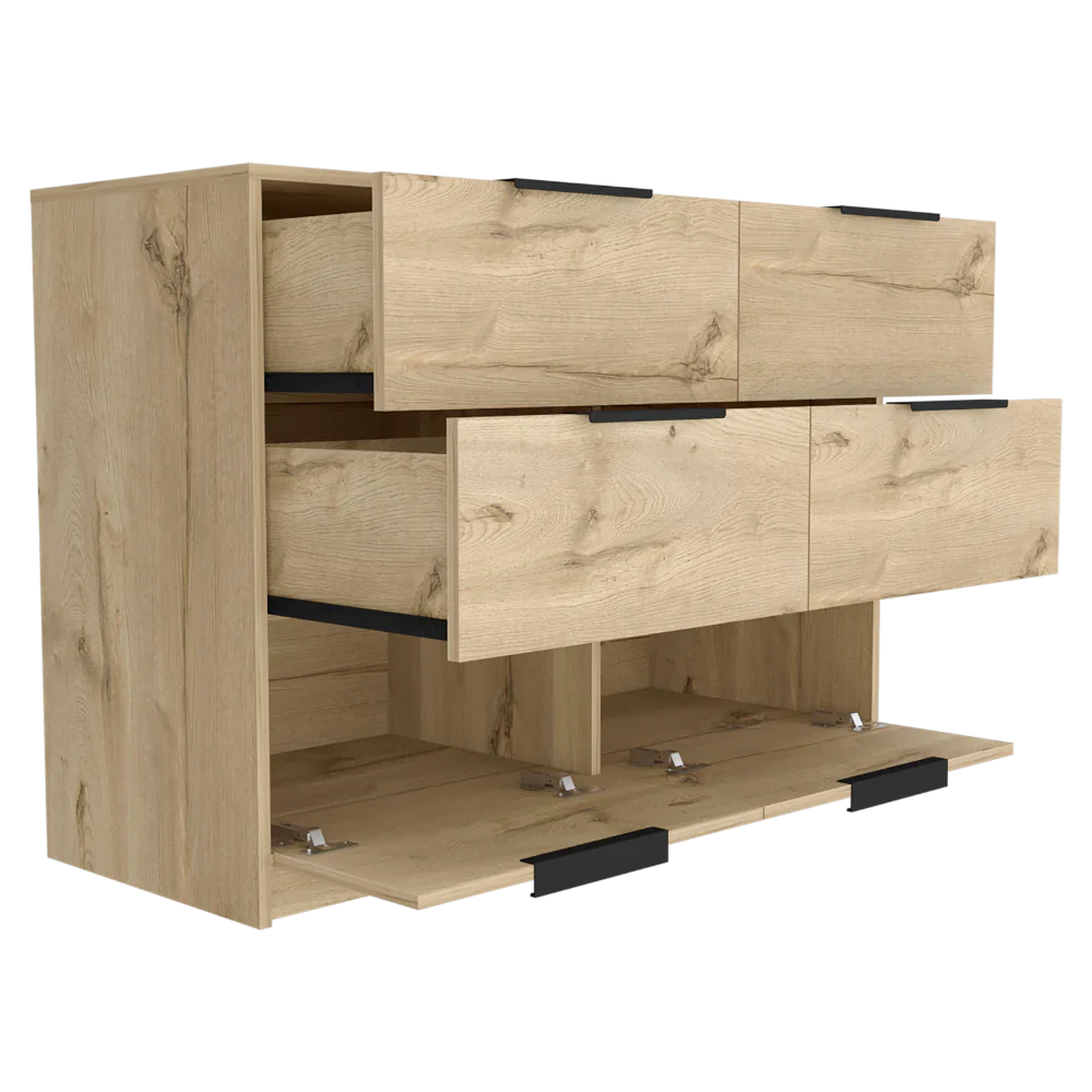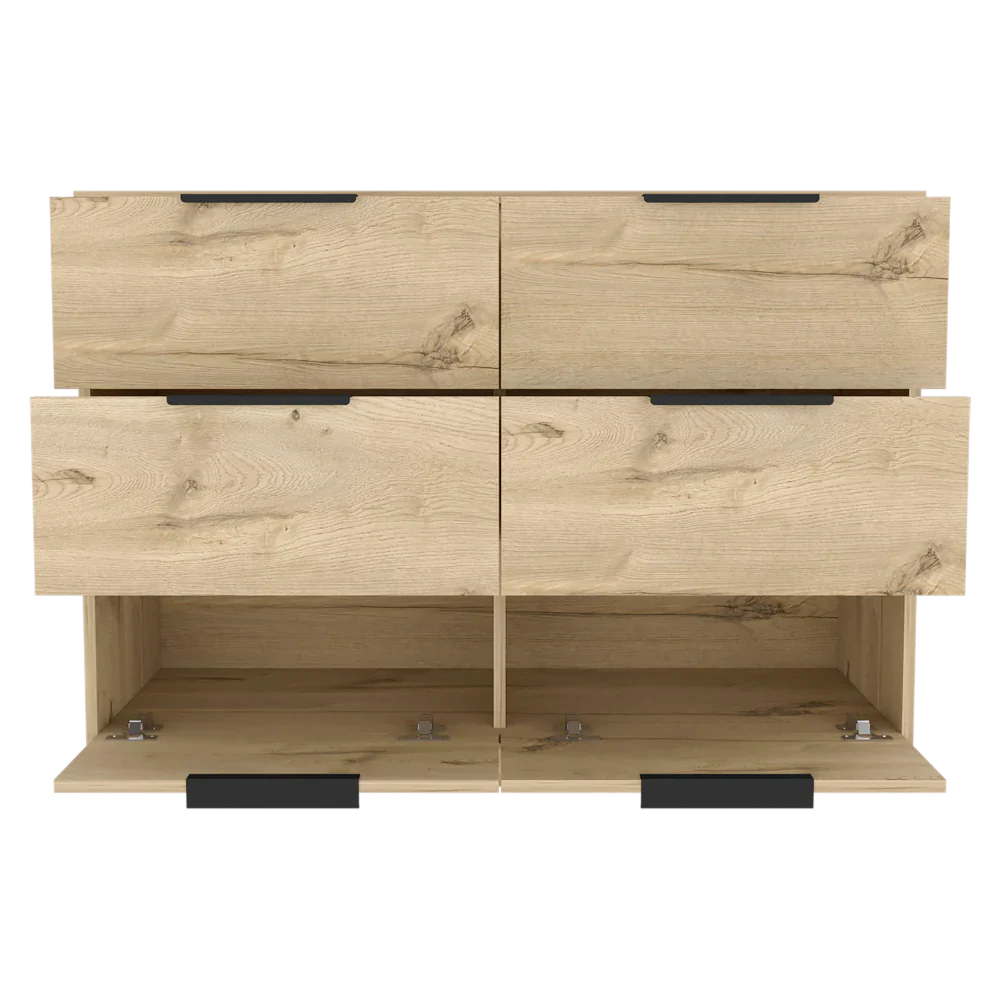 Características: Cómoda con cuatro cajones amplios, diseño moderno con combinación de colores, manijas metálicas, superficie para elementos decorativos