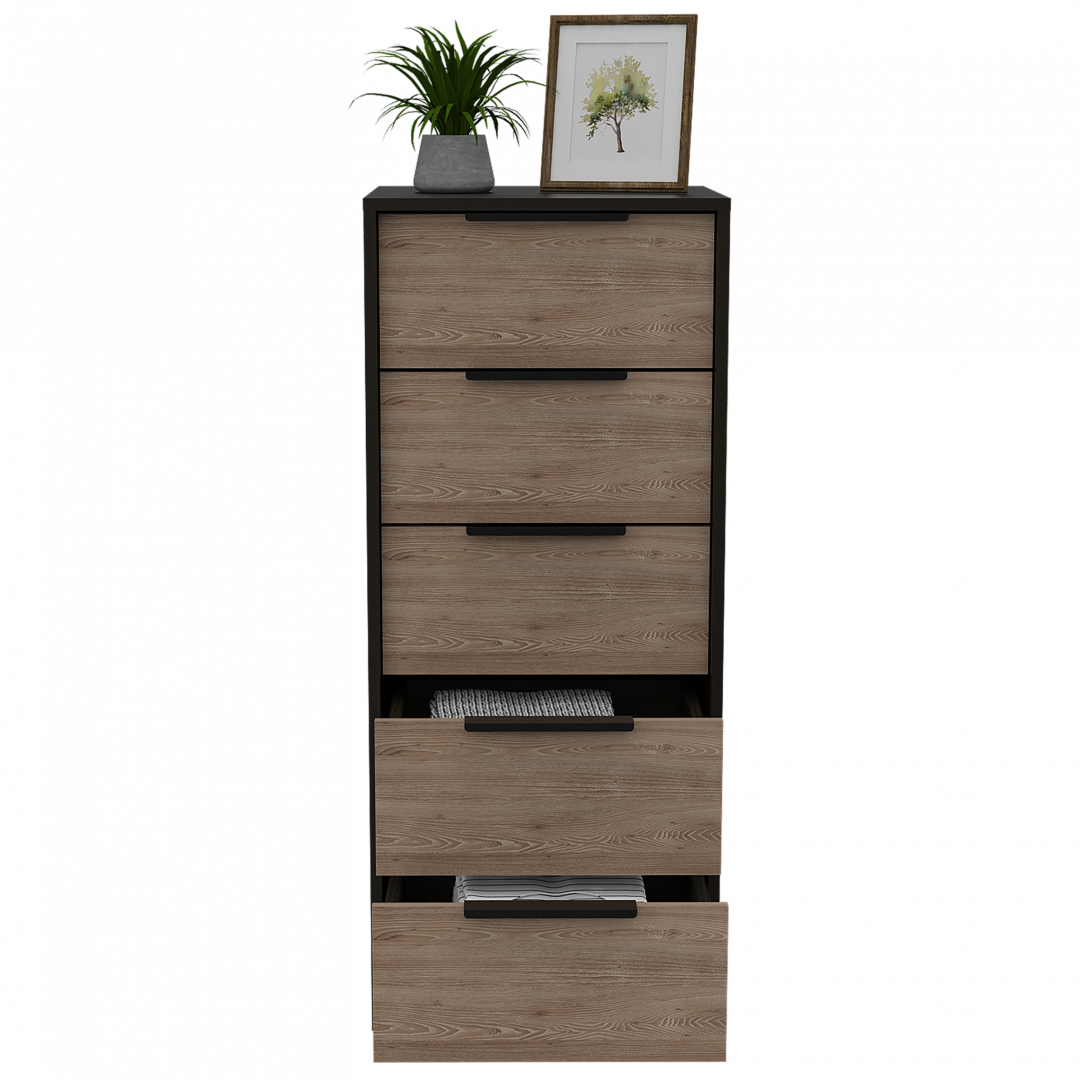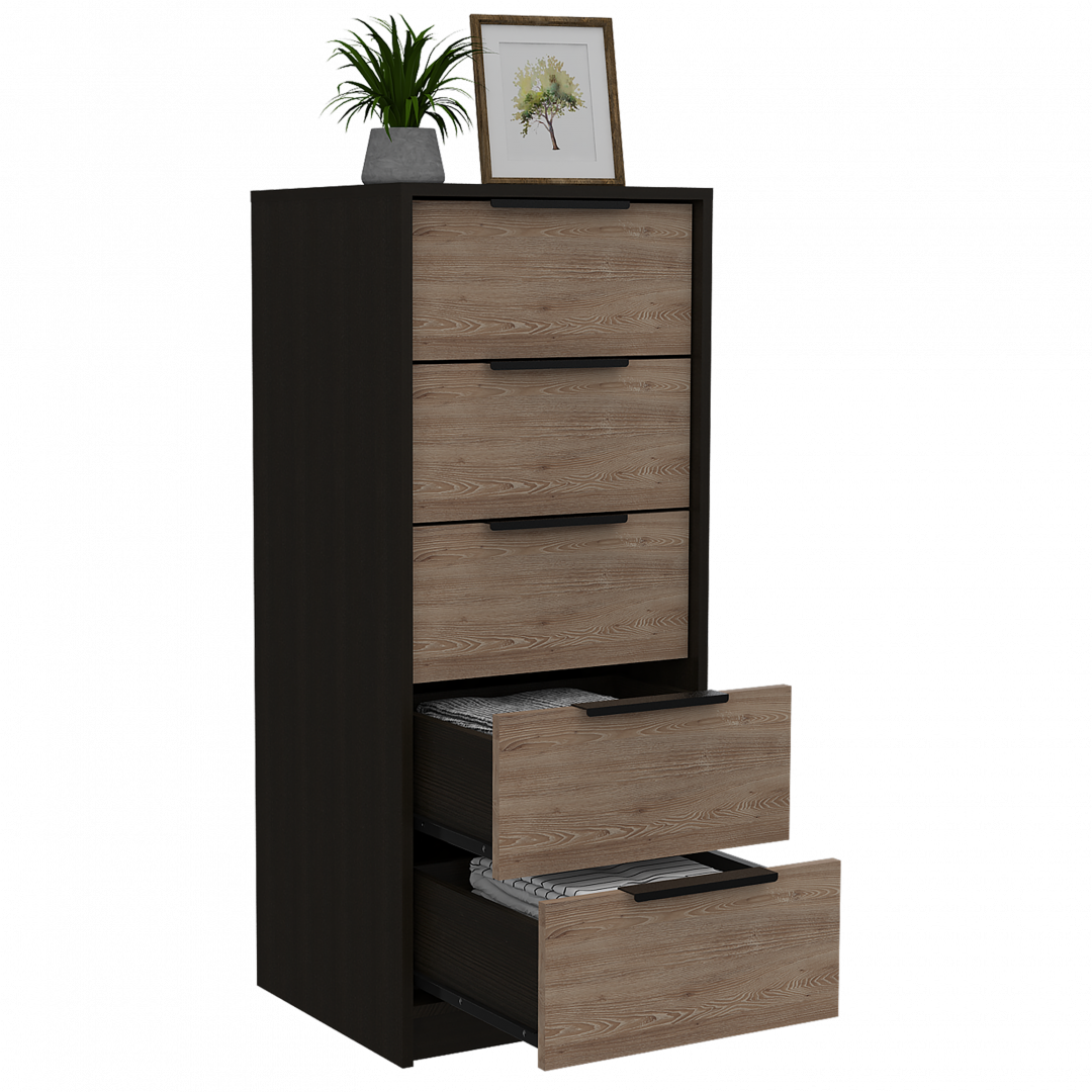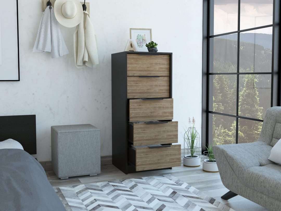 Características: Cómoda con cinco cajones, diseño moderno con combinación de colores, manijas metálicas y superficie para elementos decorativos