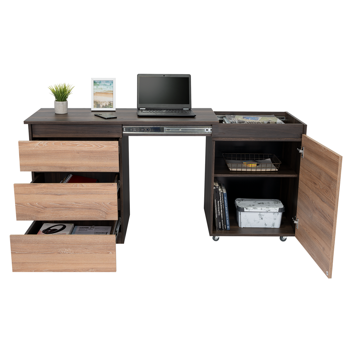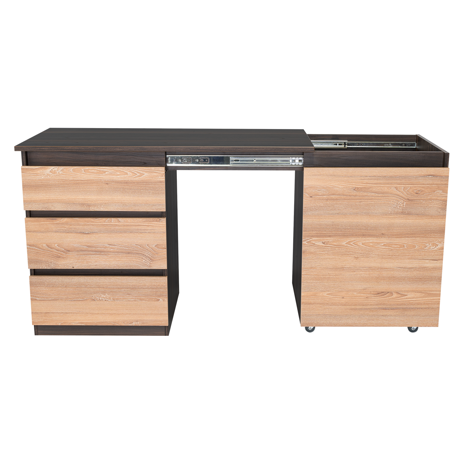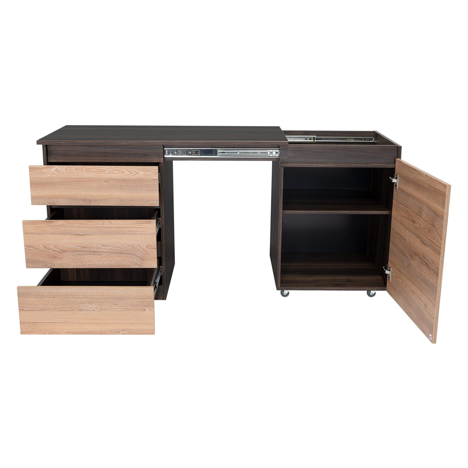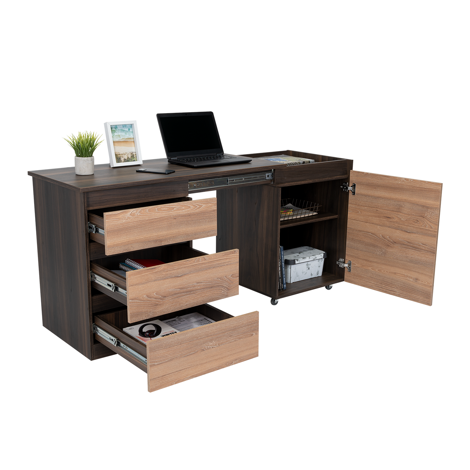 Escritorio, con modulo derecho movil que permite cambiar funcionalidad del mueble, tres cajones de extencion total