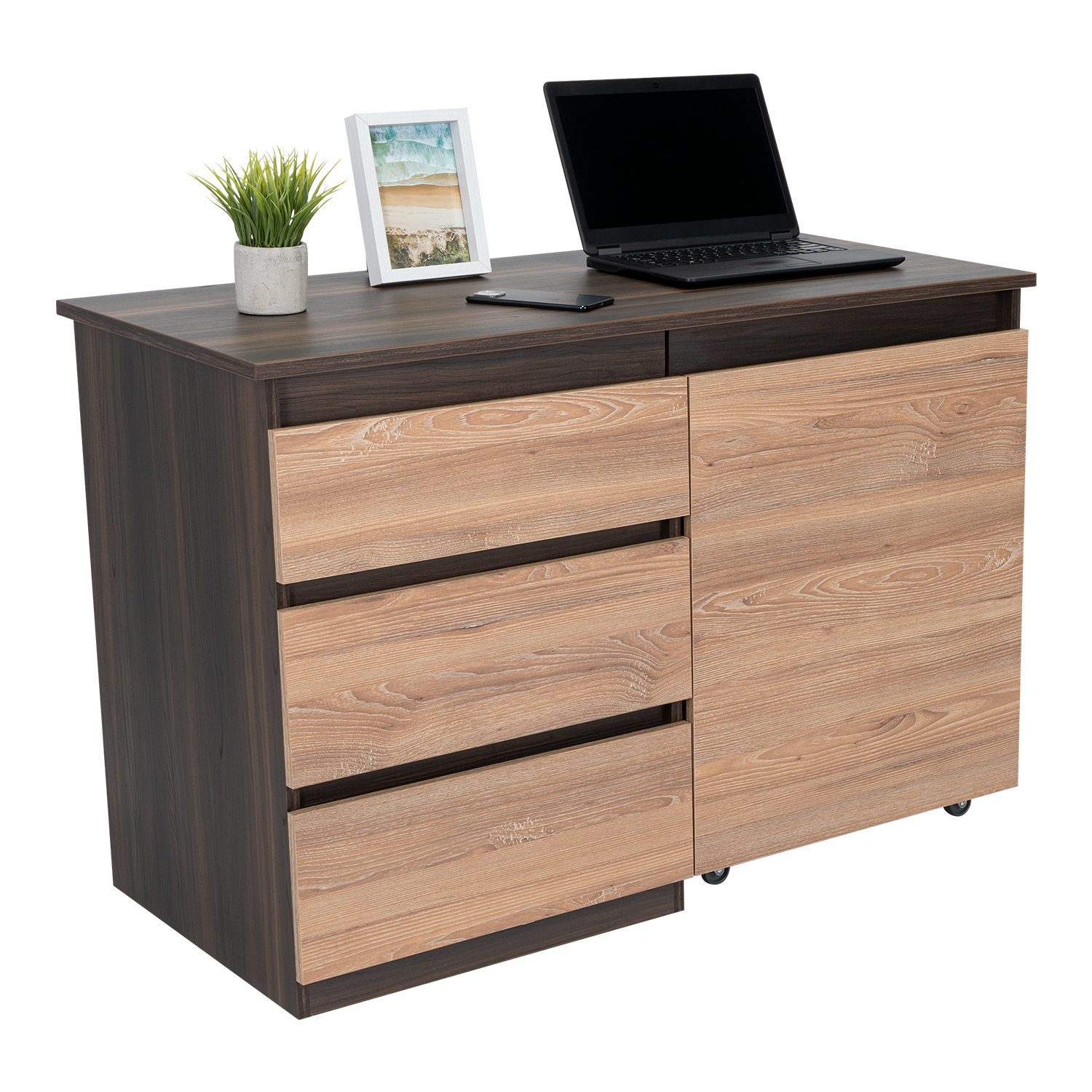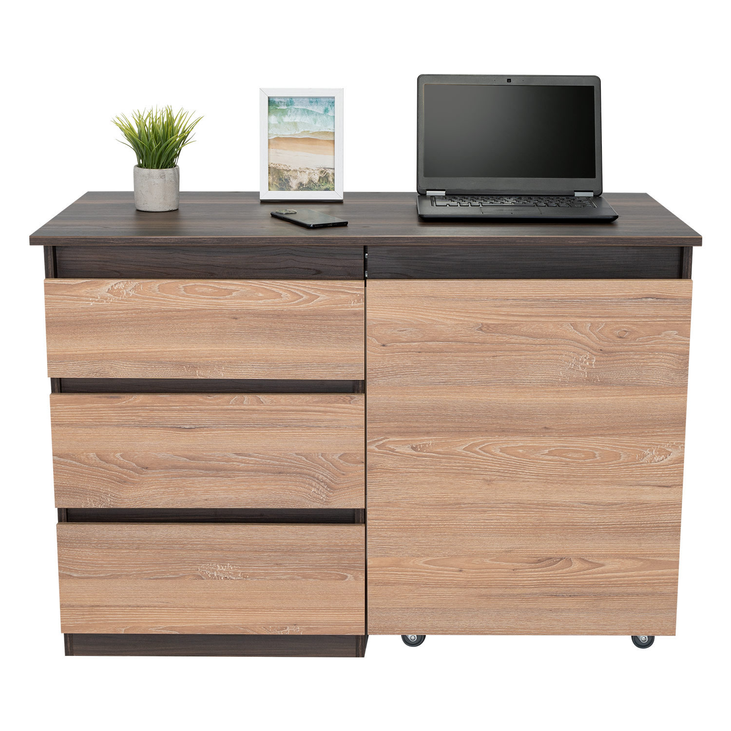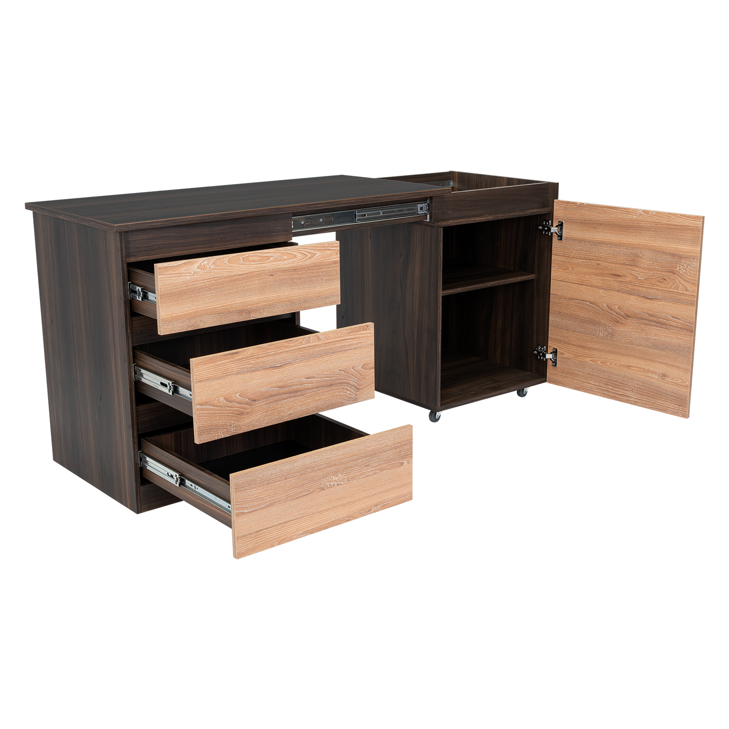 Escritorio, con modulo derecho movil que permite cambiar funcionalidad del mueble, tres cajones de extencion total