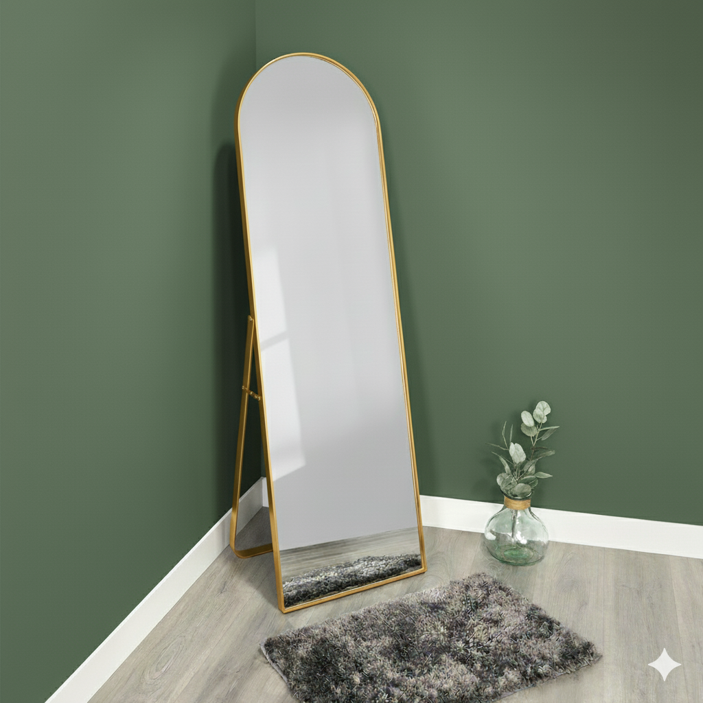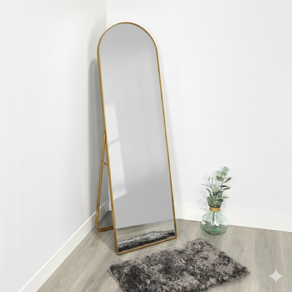 El Espejo de Piso Tony destaca por su forma rectangular rematada con un semicírculo en la parte superior, envolviendo elegancia y funcionalidad. Su marco metálico dorado aporta un toque de sofisticación, y su diseño versátil permite colocarlo tanto en el piso como colgarlo en la pared, adaptándose a dormitorios, vestidores, recibidores o salas con gran facilidad.