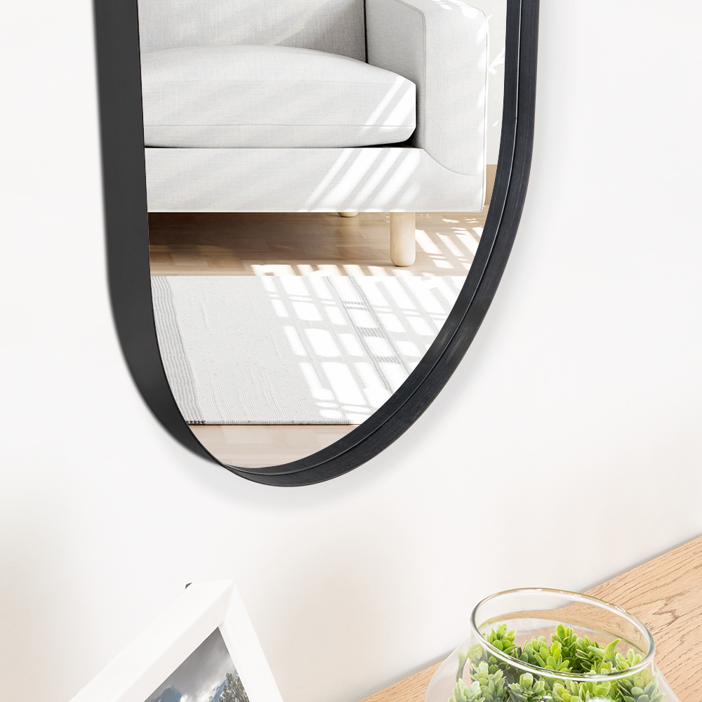 • Espejo rectangular con extremos superior e inferior en semicirculo, con estructura en PVC color negro, ensamble a la pared con chaflan.