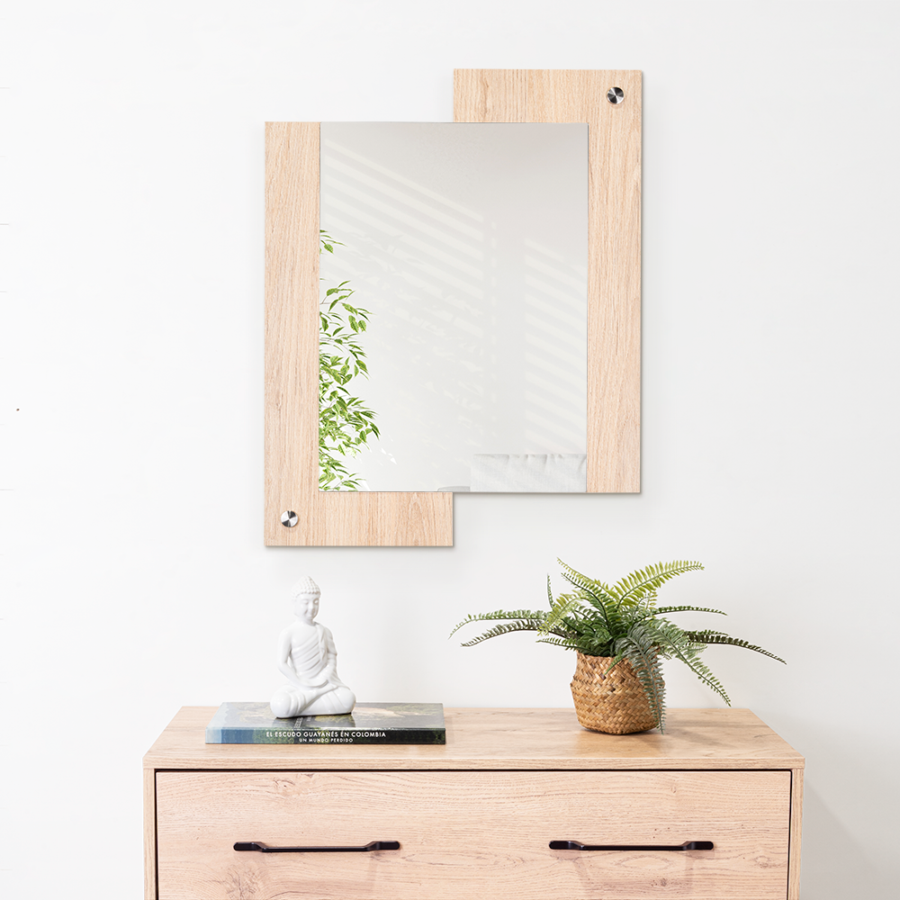 El Espejo Paduk Reflekta es espejo rectangular con dos extremos en madera clara; ensamble a la pared con chazo y tapa en acero inoxidable decorativa Con sus dimensiones de 56 cm de ancho × 71 cm de alto × 1.7 cm de espesor, se convierte en un punto focal ideal para baños, habitaciones, salas o entradas, aportando amplitud y sofisticación a cualquier ambiente.
