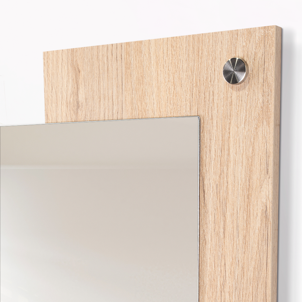 • Espejo rectangular con dos extremos en madera clara; ensamble a la pared con chazo y tapa en acero inoxidable decorativa.