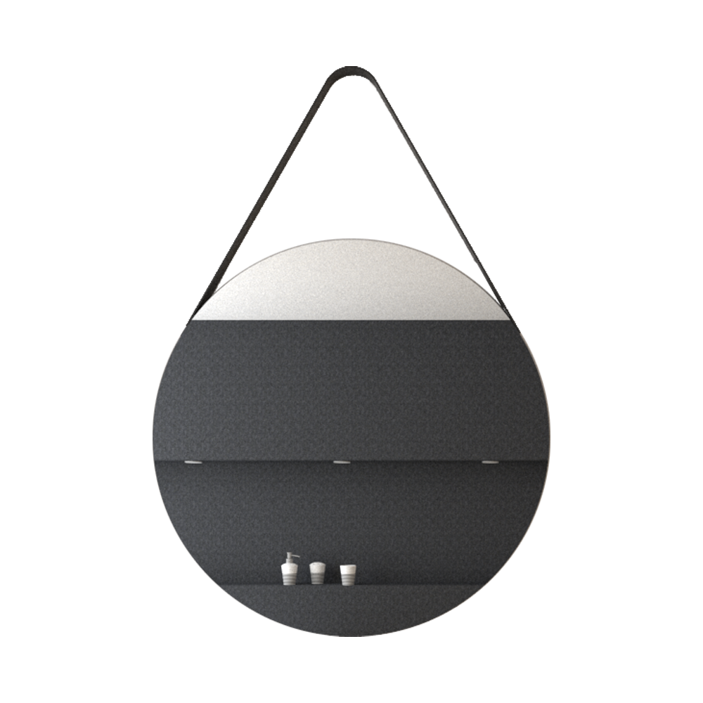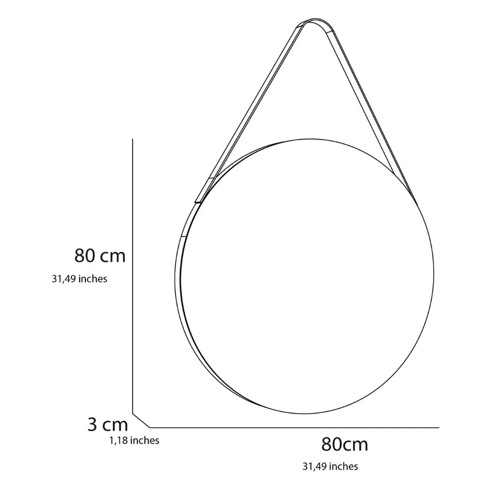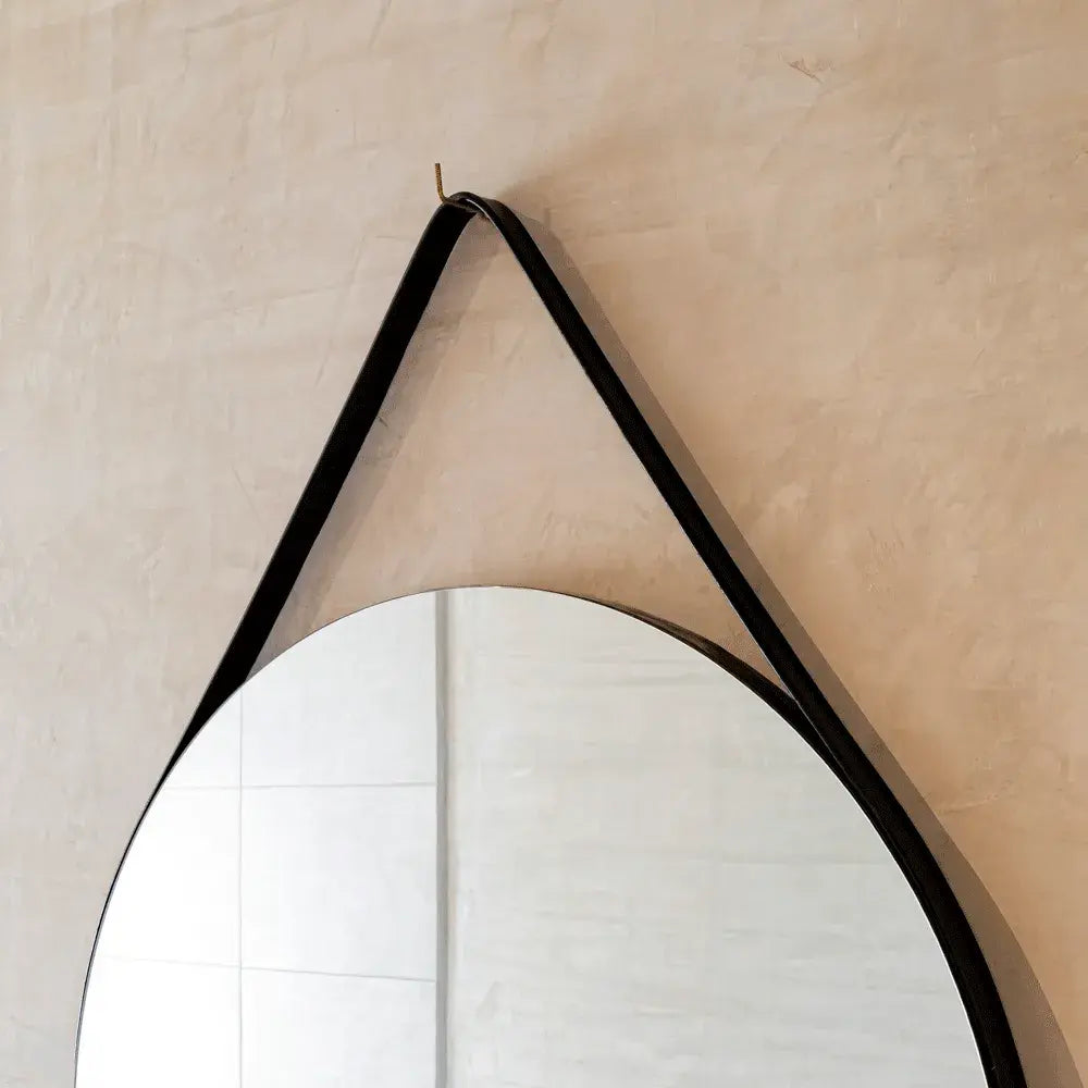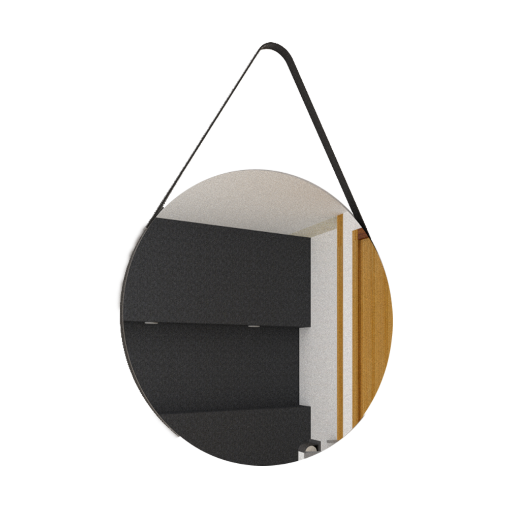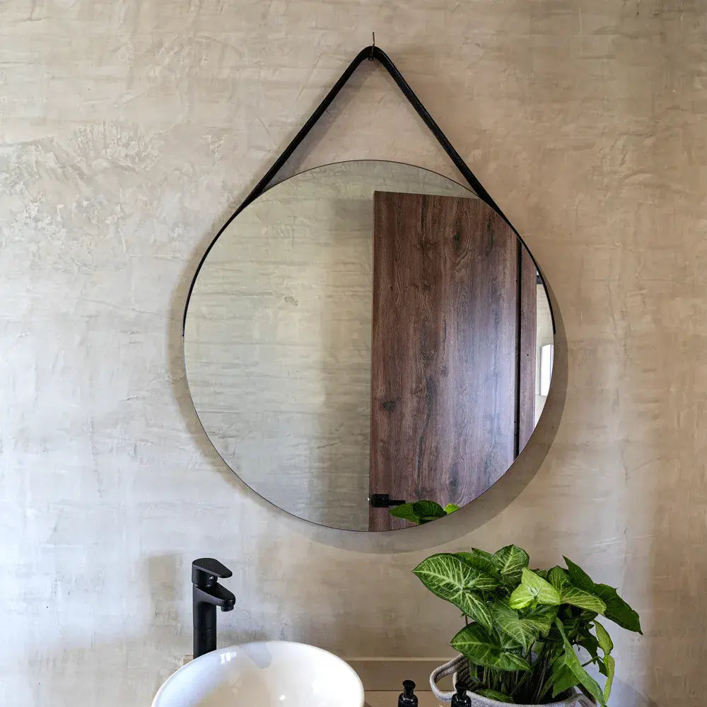 • Espejo decorativo de pared con forma circular y diseño moderno con correa de cuero.