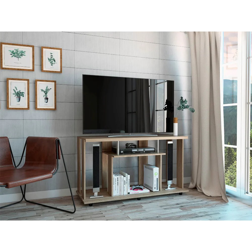 Características: Mesa con diseño moderno, espacio superior para TV de hasta 50'', espacio para equipo de audio y video, patas plásticas para fácil desplazamiento