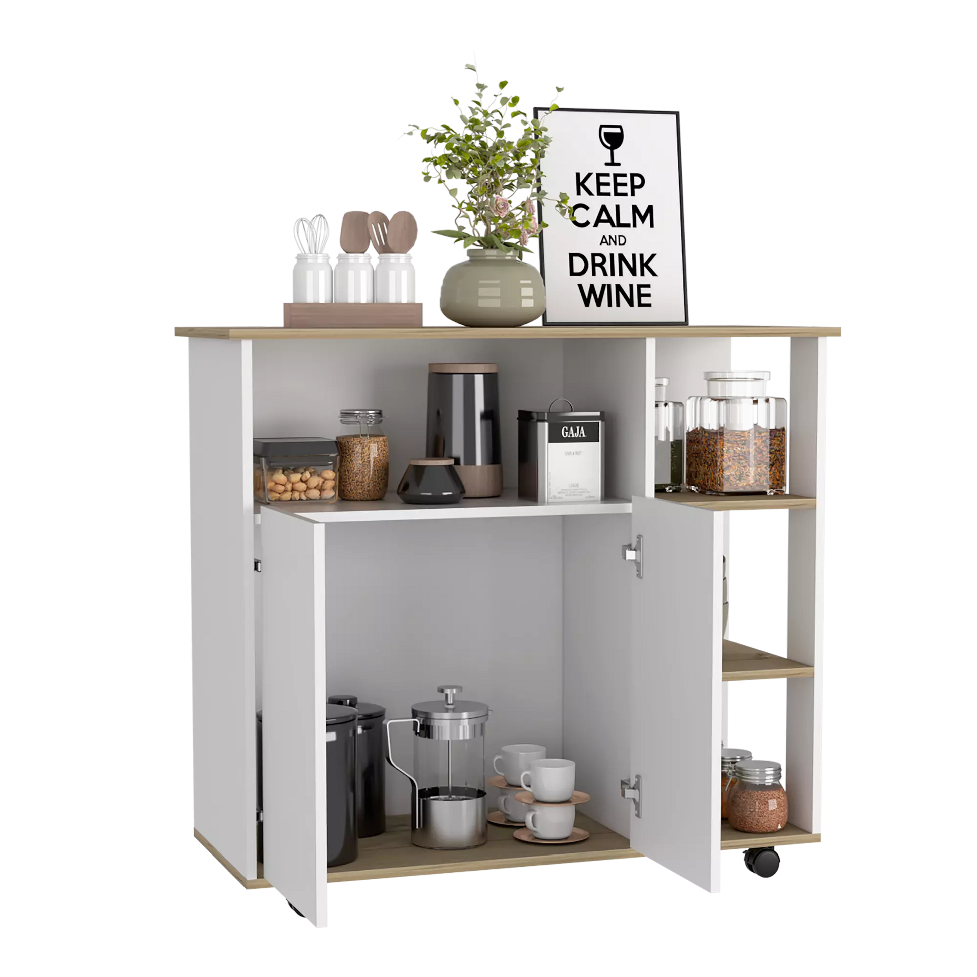 Características: Meson de cocina BiColor, con diseño moderno, tres entrepaños, rodachina y rodachina con freno