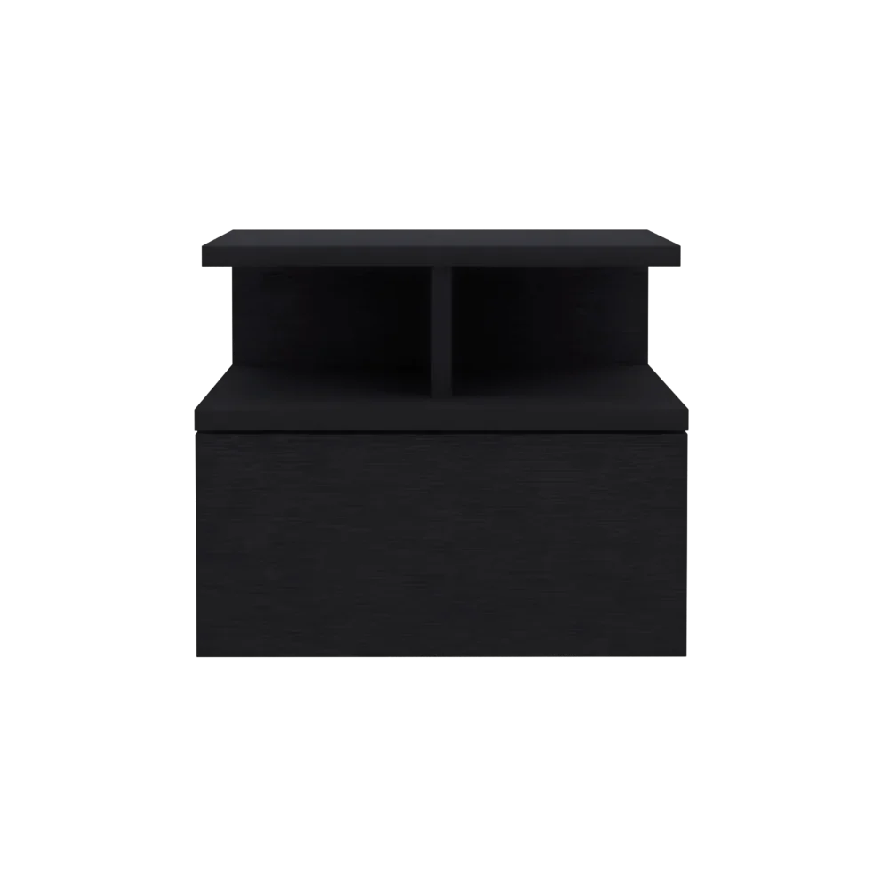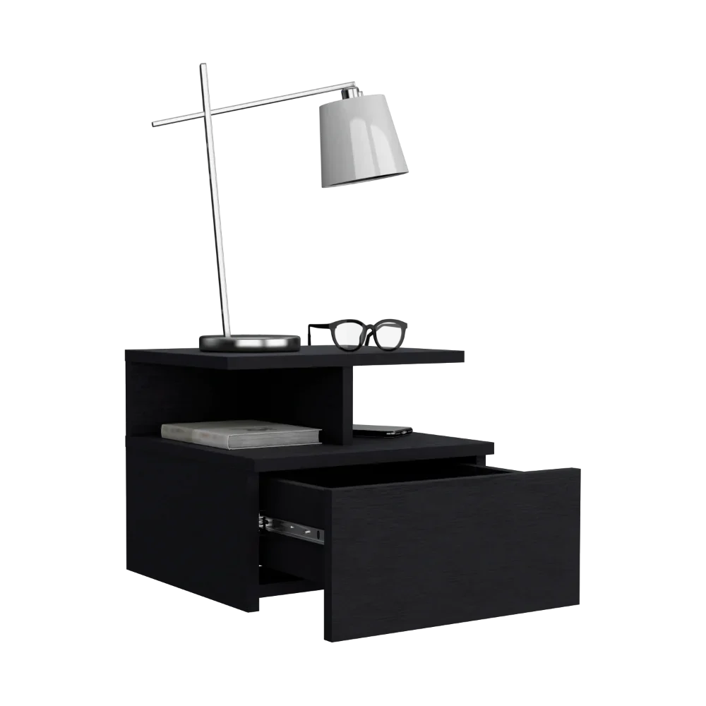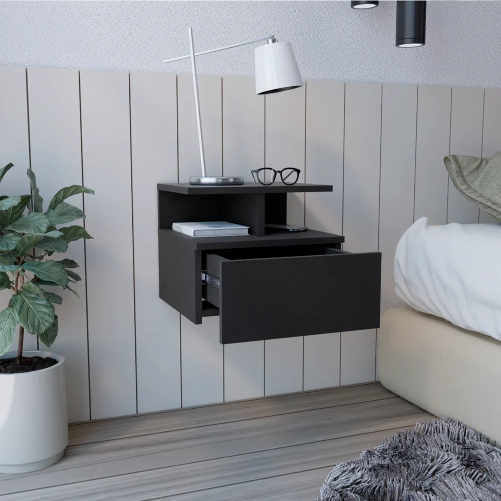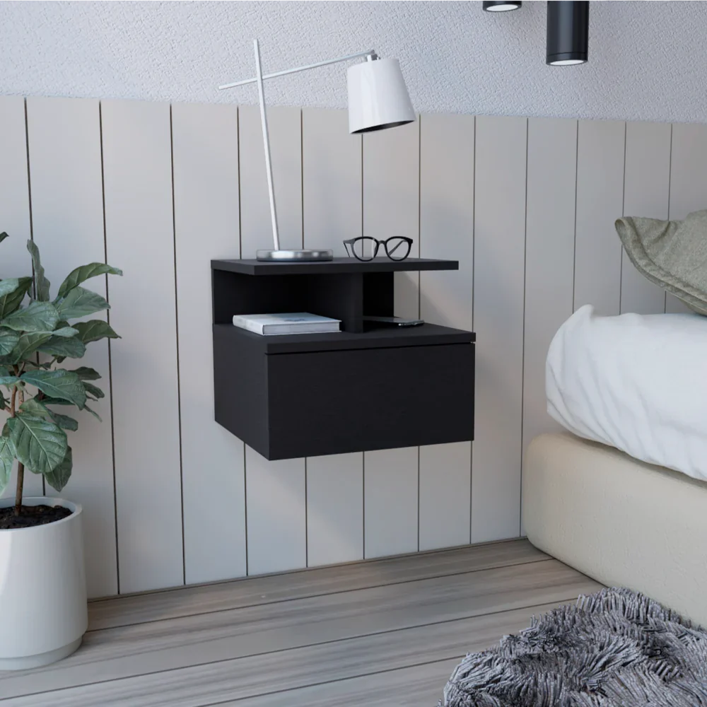 Características: Velador flotante con un cajón y entrepaño abierto para guardar y ubicar objetos, diseño limpio y montaje discreto
